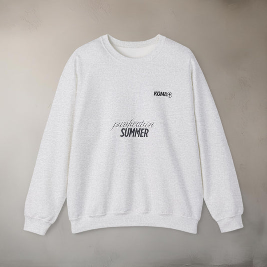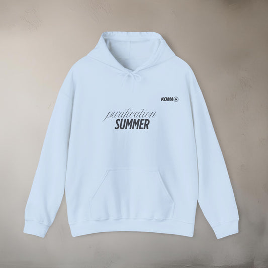 At its core: heavyweight cotton, neutral tones, bold cuts. Every piece is intentional. Our logo speaks softly. A central graphic reads “Purification Summer” — not a slogan, but a signal. A call to cleanse the unnecessary. To wear clarity.